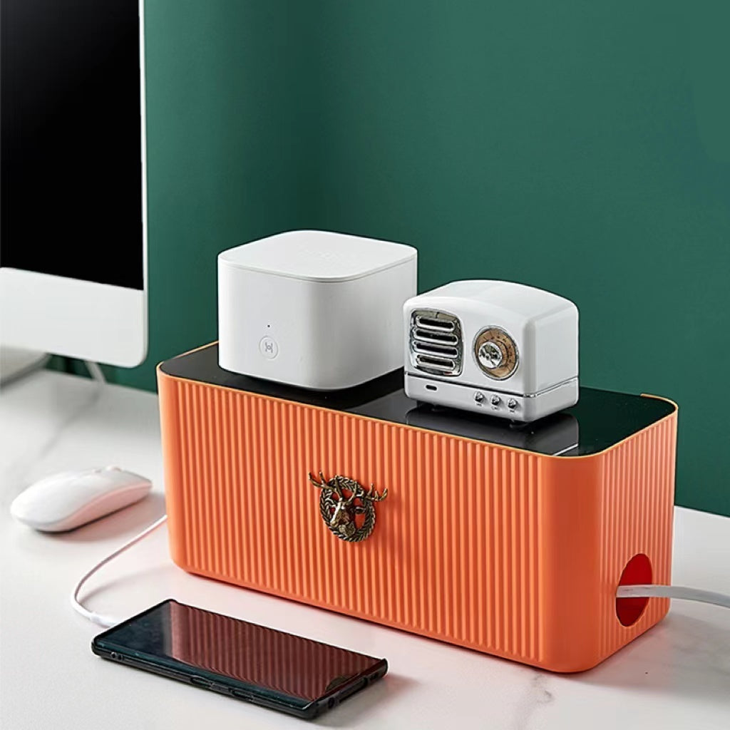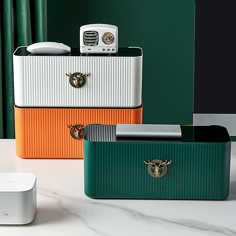 Stylowy, lekki i luksusowy schowek, zaprojektowany z myślą o schludnym ukryciu i uporządkowaniu kabli, ładowarek i drobnych akcesoriów. Wykonany z wytrzymałego plastiku w paski i z dopasowaną pokrywą, utrzymuje porządek i ład w miejscu pracy lub salonie.